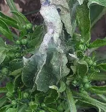 Tetranychus urticae is extremely small, barely visible with the naked eye as reddish or greenish spots on leaves and stems; the adults measure about 0.5 mm. The red spider mite, which can be seen in greenhouses and tropical and temperate zones spinning a fine web on and under leaves. The red spider mite is extremely polyphagous; it can feed on hundreds of plants, including most vegetables and food crops (peppers, tomatoes, potatoes, beans, corn, strawberries) and ornamentals: roses, etc. It lays its eggs on the leaves, and it poses a threat to host plants by sucking cell contents from the leaves cell by cell, leaving very tiny, pale spots or scars where the green epidermal cells have been destroyed. Although the individual lesions are very small, commensurate with the small size of the mites, the frequently-observed attack of hundreds or thousands of spider mites can cause thousands of lesions and thus can significantly reduce the photosynthetic capability of plants, greatly reducing their production of nutrients, sometimes even killing the plants. Although this way of feeding could spread plant viruses, this is considered of secondary importance.