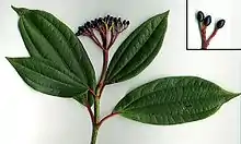 - Viburnum dentatum has flat-topped flowers, bluish fruit, and reddish leaves in autumn. It is somewhat salt tolerant. The cultivar 'Blue Muffin' is more compact than the species and has fruit that are a deeper blue than the species.