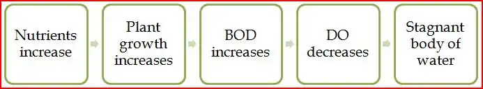 Nitrates from fertilizers and phosphates from detergents can accumulate in lakes and streams. These nutrients can increase the growth of plants and algae. This impacts the BOD because if plant growth increases too fast and the DO is not sufficient to decompose all organic material and waste by aerobic decomposition, anaerobic decomposition will occur. More species will die as a result of the anaerobic decay. The lake will become stagnant and devoid of life. Eutrophication: