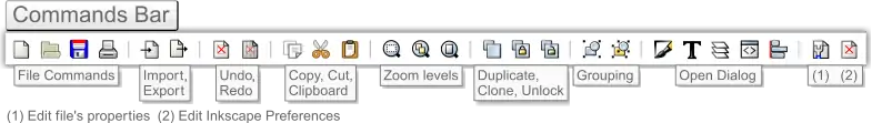 The Commands bar has buttons of frequently used edits such as file options, zoom levels, undo, copy, group, etc. Related edits are grouped along the bar and are separated by a vertical line |. A great example of this is the grouping of the highly used Zoom levels.