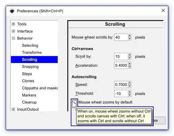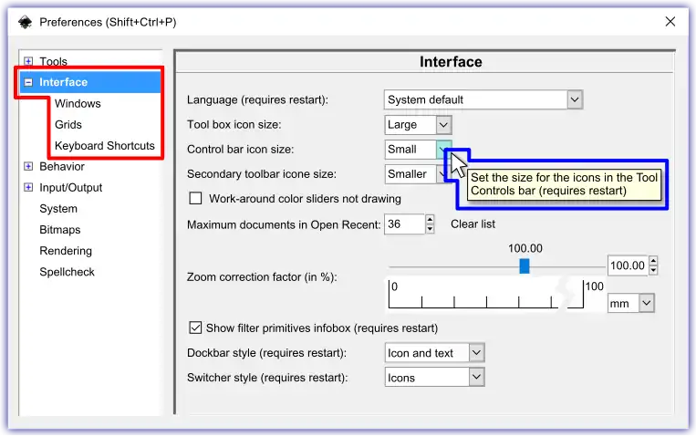 To open the Interface preferences menu, use the Menu bar ‣Edit, ‣‣Preferences... (Ctrl+⇧ Shift+P) and open the <Interface> sub-menu. There are many customizable settings available under the Interface preferences and its three sub-menus. Just like the mouseover 🖰 feature availability for on canvas edits and interface bars, you can also mouseover 🖰 preferences' window items; drop down menus, check box descriptions and value boxes.