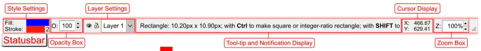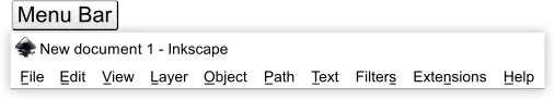 ne of Inkscape's main priorities is ease of use. This is visible on the Main Window as every bar's button (icon), numeric value and unit of measure boxes will produce tooltip (help) messages. The Menu bar is title, not button, based so when using these titled edits Inkscape still provides updated assistance. For a quick example, click the Menu's bar ‣File option, then mouseover 🖰 one of the ‣File options and there will be two feedback features. (1) The mouseover of one of the drop down menu items will highlight (background color) the item. (2) The Statusbar (bottom center) will provide an updated Notificaton message describing the highlighted Menu bar item.[1]