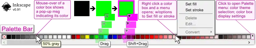- The Pallete bar below the bottom Scrollbar and above the Statusbar displays customizable color palletes.