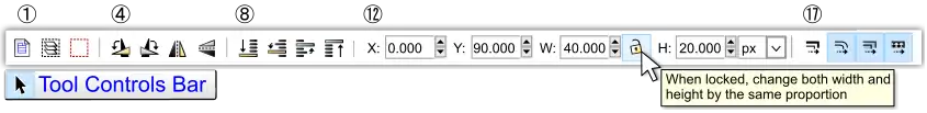 The amount of interface bar button pop-up messages support in Inkscape is very impressive, as it is hard to find a button, numeric-value and unit of measure boxes that do not generate pop-up messages on mouseovers 🖰. The Tool Controls bar example graphic shows a pop-up message, that is generated (feedback) when a mouseover 🖰 is above the Selector's Tool Controls bar open lock button.