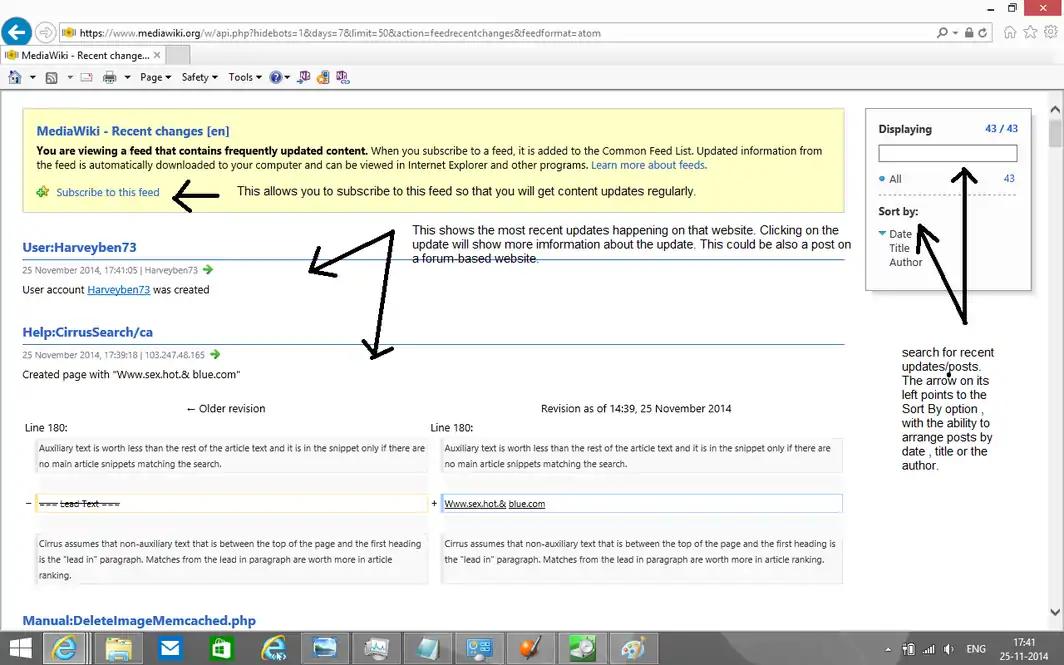 Feeds was introduced in Internet Explorer 7. Feeds are included in sites such as Wikipedia itself and allow you to get regular updates in the form of a feed. Note that feeds can also be used by other applications such as Microsoft Outlook. You can get regular feed updates. Feeds could be seen directly in Internet Explorer 7 and 8. For those who run IE9 or later, it is not shown(but it's still enabled) by default.