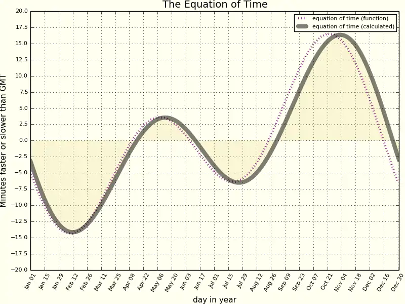 The Equation of Time graph can be approximately modeled by a function combining a couple of sine functions: