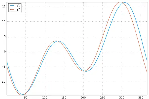 julia> plot(eq_values); julia> plot!(equation, 1:365)
