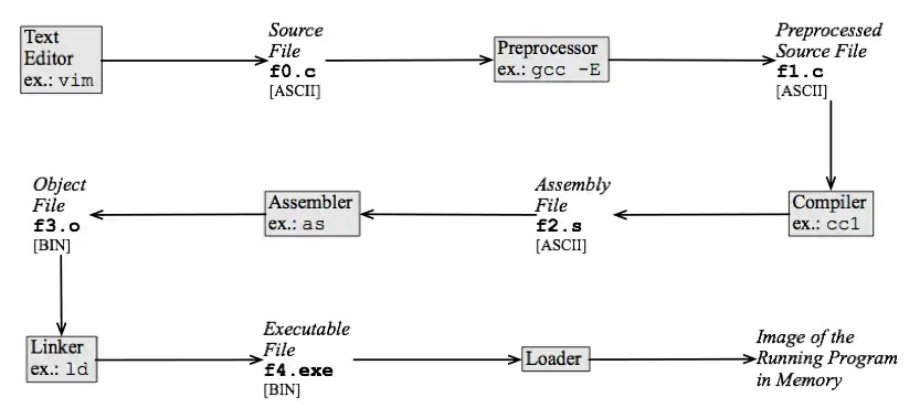 After editing the C file, a preprocessor is used to expand the macros present in the source code. Macro expansion is a relatively simple task in C, but it can be quite complicated in languages such as lisp, for instance, which take care of avoiding typical problems of macro expansion such as variable capture. During the expansion phase, the body of the macro replaces every occurrence of its name in the program's source code. We can invoke gcc's preprocessor via a command such as gcc -E f0.c -o f1.c