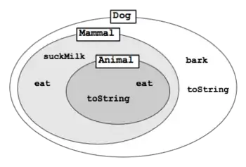 In general, if S is a subtype of T, then S contains more properties than T. For instance, in our class hierarchy, in Java, instances of Mammal have all the properties of Animal, and, in addition to these properties, instances of Mammal also have the property suckMilk, which does not exist in Animal. The figure below illustrates this fact. The figure shows that the set of properties of a type is a subset of the set of properties of the subtype.