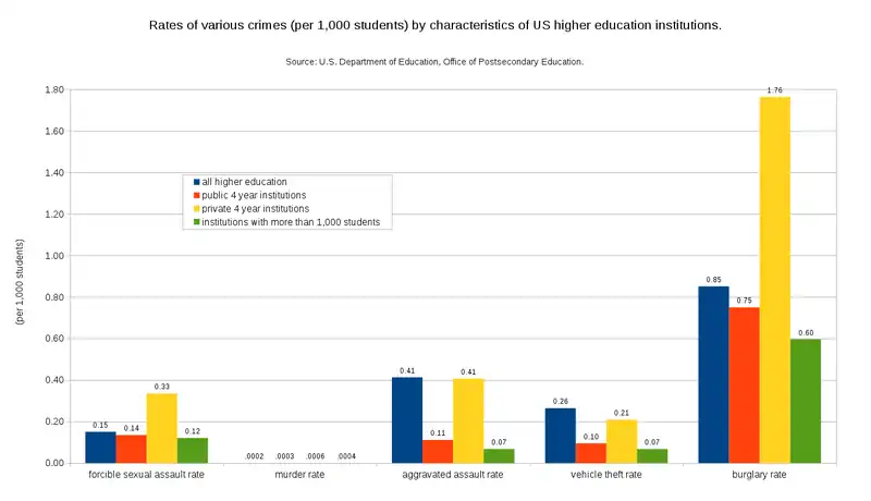 There has been a great deal of attention concerning sexual violence on college campuses in recent years. The US Federal government has raised concerns about this issue and various reports have found that colleges and universities are not addressing sexual violence as they should. For instance, many universities fail to investigate allegations of sexual assaults, they fail to encourage victims to report sexual assaults, they fail to provide adequate sexual assault training, and there are inadequate resources for the survivors of sexual assault. The figure below suggests that sexual assaults are relatively rare on college campuses. However, fewer than 5% of people raped on college campuses report their sexual assault to law enforcement, which suggests the numbers in the figure may be substantially higher than the figure reports. Further, official figures like the one below limit their reporting to "forcible sexual assault" despite mounting evidence that the vast majority of sexual assaults on college campuses do not fit this narrow definition, and typically involve more subtle forms of sexual violence and coercion.[25][26] In fact, in-depth analyses of sexual violence on college campuses generally reveals that sexual assault has become a normal aspect of college experience, culture, and structure for many American women, that on average 1 in 5 college women will be sexually victimized in some way during their college careers, and that common forms of college leisure activity, such as Greek, Party, and Drinking cultures and habits on campuses, often facilitate the normalization of college sexual assault.[27][28]