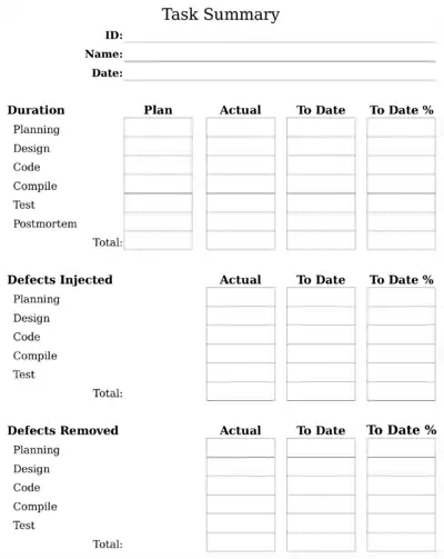 The following artifacts (or documents, records, etc.) are produced during a PSP process. The images link to PDF versions of the forms.