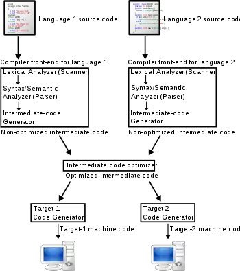 This front-end/middle/back-end approach makes it possible to combine front ends for different languages with back ends for different CPUs. Practical examples of this approach are the GNU Compiler Collection, LLVM, and the Amsterdam Compiler Kit, which have multiple front-ends, shared analysis and multiple back-ends.