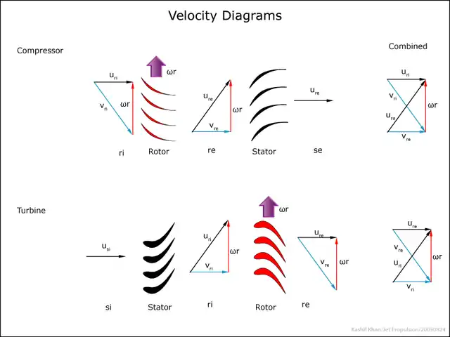 Basic analysis of the effect of the blade rows on the airflow can be done through velocity triangles. The figure below shows a basic set of velocity triangles for compressor and turbine rows.