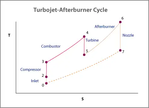 Addition of an afterburner (5-6) allows thrust augmentation as can be seen from the increased area of the diagram shown below. The afterburner operates in the higher entropy range and has lower efficiency than the base turbojet.