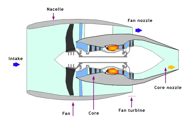 A gas turbine engine that has a shrouded fan whose flow bypasses the core. The relative size of the fan is captured by the bypass ratio.