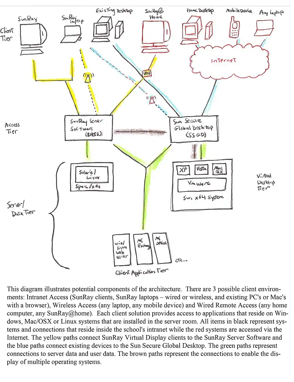 To illustrate the solution, Sun Microsystems Virtual Desktop Solution is described below. The SunRay is a "thin" or "virtual display" client. Virtual display clients are just as they sound. They display any desktop as though they were running locally, but in fact they are running at the server level. Sun Microsystems, like the Apple model, is the sole manufacturer of SunRay's in the desktop form factor and they also make the software that drives this architecture. Companies like Accutech and Naturetech make SunRay laptops. There is no configuration, operating system, or data residing on the student computers which offers more security and manageability over traditional PC's or Mac's. Sun is helping schools to manage challenges such as limited budgets, rising costs of desktops, patch management overload and desktop downtime ("Sun Virtual Desktop Solution: Connecting the Campus", 2008).