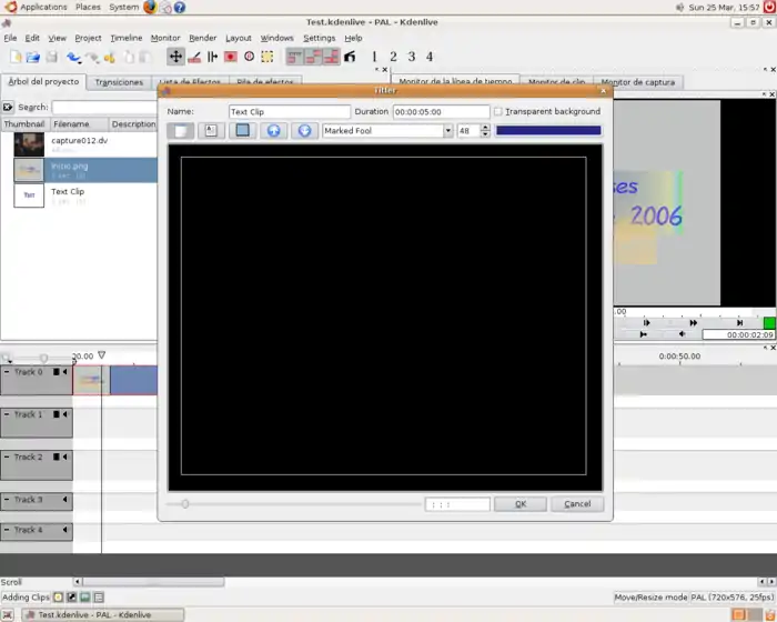 Firstly, we are going to create a title clip for your project. Kdenlive is able to create simple titles. We can also work with external image editors (like GIMP) to create more sophisticated titles and then add them to the project list as explained above.