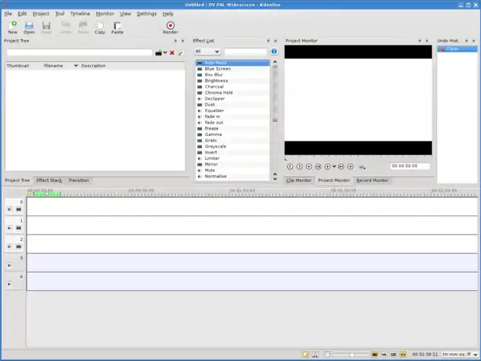In the default layout, there are five docks in the main window. Whilst all docks in Kdenlive are fully configurable, it is assumed for this tutorial that you are using the default layout.