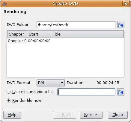 - In this screen you should enter the folder name where the DVD structure should be created and the DVD format (PAL/NTSC). Be sure that the option "Render file now" is selected.