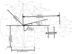 The geometric construction according to U.S. Patent 6,260,862 or more specifically the patent holders website[10] has six input variables. We will consider the stride length as an input as well (here input 0), as table 2 uses bigger stride length. (notice that the same effect can be achieved by scaling all points and lengths proportionally)