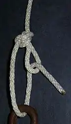 - Tie two half hitches, usually slipped for easy releasing, though a more secure finish may be called for. Whatever knot is used to secure the end to the loop, it should be kept in mind that when it is time to untie the knot, the knot will typically still be under load. Many knots are extremely difficult to untie under load. Even a half hitch may be challenging to untie even after the slipped second half hitch is pulled out.