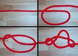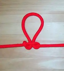 ![]() ![]() Use: The Man harness is a knot with a loop on the bight for non-critical purposes. This knot is used when multiple people are to pull a load. Typically one end of the rope is tied to a load, and one man harness knot per puller will be tied along its length. Each loop is then pulled by a different person.