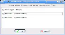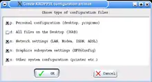 Personal configuration. If you have a persistent Knoppix home directory, you do not need this. If you do not have a persistent Knoppix home directory, this option covers the personalised settings you have made in programs like the KDE Control Center, and your personalised settings in applications such as AbiWord. It does not include document files, such as saved word processor files. It also does not include cache files from web browsing.