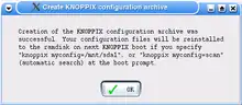 - If it worked, it will say, “Creation of the KNOPPIX configuration archive was successful”. It will tell you the command to use at the boot prompt to load the saved settings.