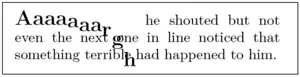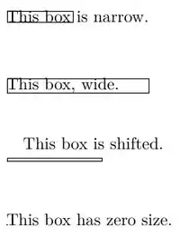 Makebox creates a single-line box, optionally of fixed width, but otherwise large enough to hold its contents. Note that the width does not have be wider than the contents: for instance, setting width to 0 typesets the content without changing the current position. (E.g., this would allow for an overstrike.) Makebox is typically used to prevent hyphenation (see Hyphenation) or simply to keep text that belongs together from being placed on separate lines. You cannot place line breaks (\\) within a Makebox. mbox is the shorthand no-option version of Makebox.