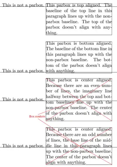 is placed so the baseline of that chosen line of text is aligned to the baseline of the box that the \parbox