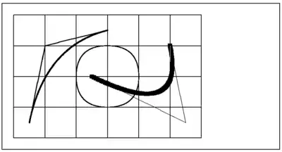 The control points of the two Bézier curves were calculated with formulas (*). The positive branch is determined by , and , . Again, the picture is defined in mathematically convenient coordinates, and the lower left corner is assigned the mathematical coordinates (−3,−2) (black disk).