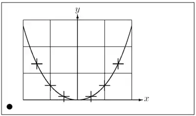 In this figure, each symmetric half of the catenary is approximated by a quadratic Bézier curve. The right half of the curve ends in the point (2, 2.7622), the slope there having the value m = 3.6269. Using again equation (*), we can calculate the intermediate control points. They turn out to be (1.2384, 0) and (−1.2384, 0). The crosses indicate points of the real catenary. The error is barely noticeable, being less than one percent. This example points out the use of the optional argument of the \begin{picture}
