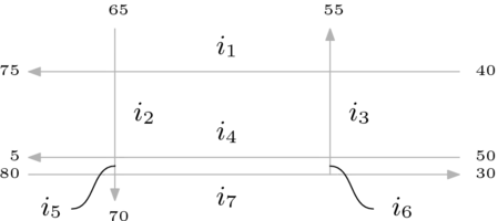 - Label the three between-road arcs in the circle with a variable. Using the (adapted) Current Law, for each of the three in-out intersections state an equation describing the traffic flow at that node.