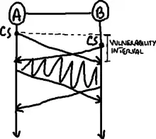 The vulnerability interval is defined as the time interval where starting a transmission by the far node would create a collision (it is equal to the propagation delay on the channel), and this interval is as larger as distance increases → this protocol works well on small networks.