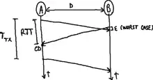 A constraint between the frame size and the collision diameter exists so that all collisions are recognized: collision detection works only if the round trip time , that is the outward and return time, is lower than the transmission time :