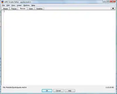 - Aliases - This tab is for aliases, commands that stand for one or more other commands. An example of an alias would be: hello msg $active Hello, I'm $me $+ .