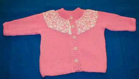 The neck requires a border too, either a rib border or a crochet border with holes for a string, otherwise it becomes too large. Likewise, the bottom edge and the wrist edge must have a crochet border, otherwise they will roll.