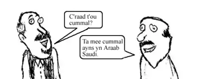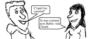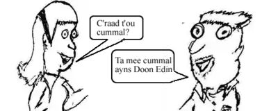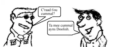 Craad ta'n dooinney cummal? Ta'n dooinney cummal ayns Doolish. - Where does the man live? The man lives in Douglas.