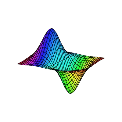 > plot3d(x*exp(-x^2-y^2),x=-2..2,y=-2..2,color=x,orientation=[120,75]);