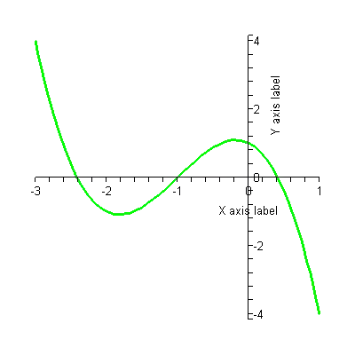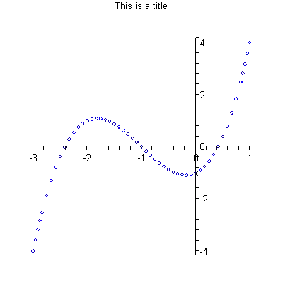 >plot(x^3+3*x^2+x-1, x=-3..1, colour=blue, style=point, title="This is a title"); #Image on the left >plot(-x^3-3*x^2-x+1, x=-3..1, colour=green, thickness=2, labels=["X axis label", "Y axis label"], labeldirections=[horizontal, vertical]); #Image on the right
