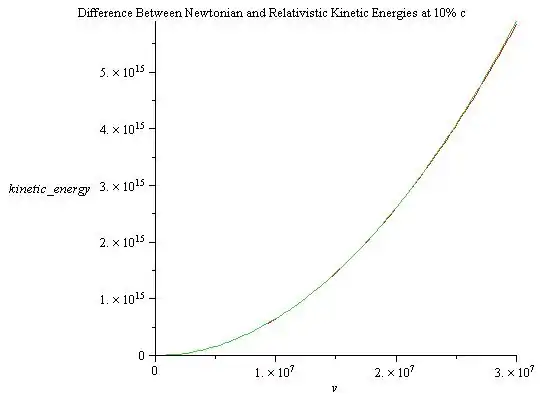 plot([kinetic2(13, v), kinetic (13,v)], v=0..(.1*c),kinetic_energy, title="Difference Between Newtonian and Relativistic Kinetic Energies at 10% c");