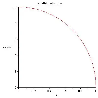 Explained by the theory of special relativity, length of an object as viewed from another frame of reference contracts as it moves in a direction along its length. In fact, as the object's relative velocity approaches the speed of light, the length of the object approaches zero. In theory, the object will never actually reach the speed of light. The equation for this is L_prime= L/Gamma. L_prime is the contracted length, and L is the 'proper length' or the length measured in the frame of the object. Gamma is the problem above. Plot the graph of L_prime for a limousine that is 10 meters long from v=0 to c.
