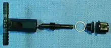 A common implementation of an overflow valve is a spherical element similar to a ping-pong ball which will block the suction channel when elevated. The ball is buoyant and is elevated by increasing level of liquid. Such a valve is below the lid of the Laerdal collection vessel. The ball is immediately above the blue dyed water. The valve must be cleaned thoroughly along with other surfaces in the vessel when it is emptied and cleaned.