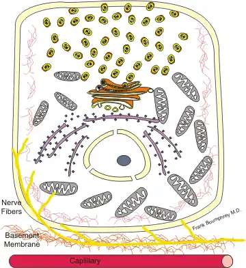 Digestive enzymes are secreted by glandular cells which will store the enzyme in secretory vesicles until they are ready to be released. These cells are characterised by a robust rough endoplastic reticulum and numerous mitochondria. Passage of materials from the ribosomes, through the endoplasmic reticulum and Golgi body to the secretory vesicles takes about 20 minutes.