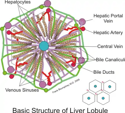 The illustration below shows a schematic diagram of a liver lobule. Blood is conveyed to the lobules by branches of the hepatic portal vein and the hepatic artery. It then flows through sinuses, bathing the hepatocytes, to the central vein of the lobule, a branch of the Hepatic vein which drains into the Inferior Vena Cava. The hepatocytes secrete bile into bile canuliculi running between the hepatocytes, and these drain into branches of the bile duct.