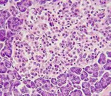 The pancreas is a large endocrine and exocrine gland situated retroperitonealy beneath the stomach. The endocrine portion of the gland secretes Insulin and glucagon from the Islets of Langerhans (see thumbnail of histology). This function of the pancreas will be looked at else where. The microscopic structure of the pancras is similar to the salivary glands, the acini secrete enzymes, and the ductules and ducts secrete large quantities of a bicarbonate rich juice. These travel down the pancreatic duct to the second part of the duodenum where it exits via the Ampulla of Vater, protected by the Sphincter of Oddi.