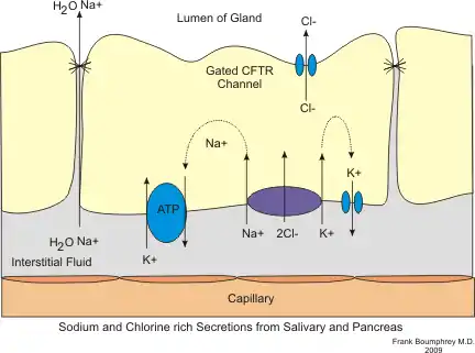The sodium ions are actively reabsorbed, and the potassium ions are actively secreted at the luminal side of the cell with an excess of sodium reabsorbtion causing a -70mV gradient. This causes passive reabsorbtion of chlorine ions. Bicarbonate ions are both passively exchanged , and actively secreted in exchange for chlorine. This is illustrated in the diagram below.
