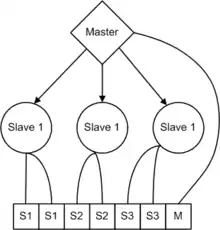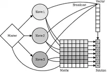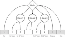 MPI implementations allow a user to launch several processes which will each have a defined numerical identifier, its rank. Conventionally, we will consider that the master is the process which has the rank '0'. All other processes are slaves. In this program, the master divides the array into sub-arrays and sends these to each slave. Each slave will then calculate the sum of its sub-array. In the case where the size of the array is not an even multiple of the number of slaves, the master will finish the remaining work by calculating the sum of the last values of the array (see figure below).