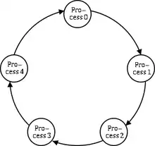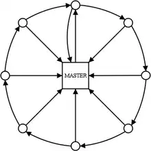 The second topology illustrated looks like to a ring topology and introduce a new routine: MPI_REQUEST_FREE. The master will always send data to the process 1 and receive the result from any others processes (see figure below).