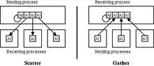 The collective communications (like MPI_BCAST, MPI_SCATTER and MPI_GATHER) send data on the processes that belong to a same group. MPI provide functions for managing groups and communicators. This allows to use collective communications on specified processes and thus to divide a network into groups which can execute different task.